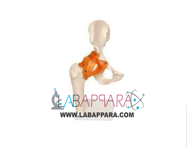 Human hip joint model includes artificial, flexible ligaments & demonstrates different movements of hip joint like ante version, retro version, abduction & internal/external rotation.